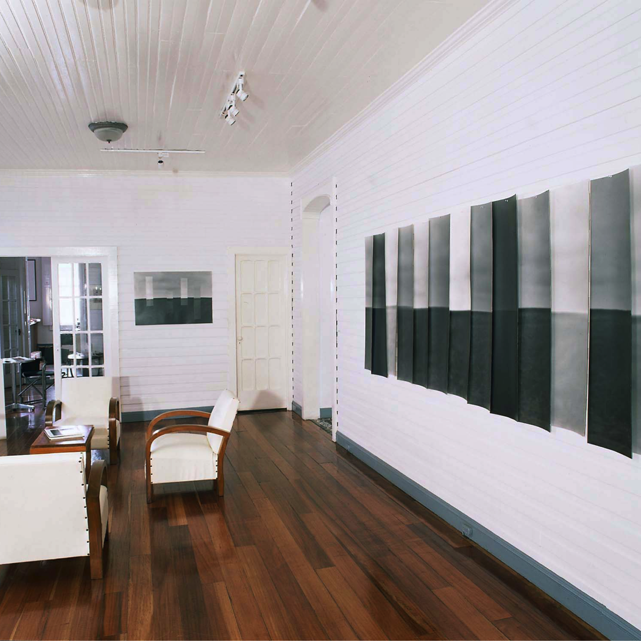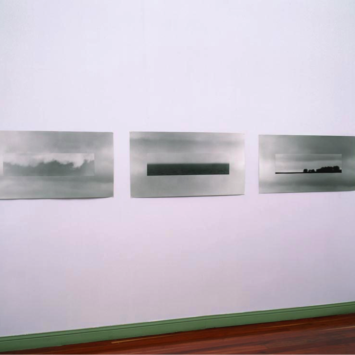 Estas fotografías, armadas en obras modulares, en donde cada una es el antecedente de la otra, son como “suites” de imágenes un tanto difusas, miradas sucesivas o fugaces de un horizonte eternamente plano que construye un paisaje cambiante a partir de las relaciones entre cielo y mar. Retoman la dinámica del artista de crear de una imagen a partir de fragmentos de otras, se articulan como la reconstitución de un imaginario personal que evoca sobre todo el fluir del tiempo pero que igualmente plasma su atomización en la memoria. El paisaje aquí deja todo dramatismo, es una decantación total de elementos hasta llegar a lo que lo define en primera instancia: su horizontalidad. Lejos estamos de las líneas abruptas y barrocas de los volcanes y valles centroamericanos, es la naturaleza más despojada y desnuda que se pueda imaginar: un horizonte vacío evocador, que divide el cielo del mar, una gama de grises cuya intensidad está determinada por esos instantes cambiantes que capta el artista durante varias semanas y que luego recorta y ensambla, alterando ya no la imagen física sino el concepto del tiempo en sí, al provocar una simultaneidad de atmósferas diversas en cada pieza. El “Currere Rutinarius” es una de las piezas donde se evoca con más fuerza el ir y venir de la luz en el tiempo, sus fragmentos verticales podrían repetirse tantas veces como minutos en el día. Obras como “Eco” adoptan su superposición cuadrangular que sugiere la onda expansiva de algún sonido proveniente de un punto lejano o los sucesivos cortes en la mirada. En todas ellas, el paisaje se reduce a su propia evocación.