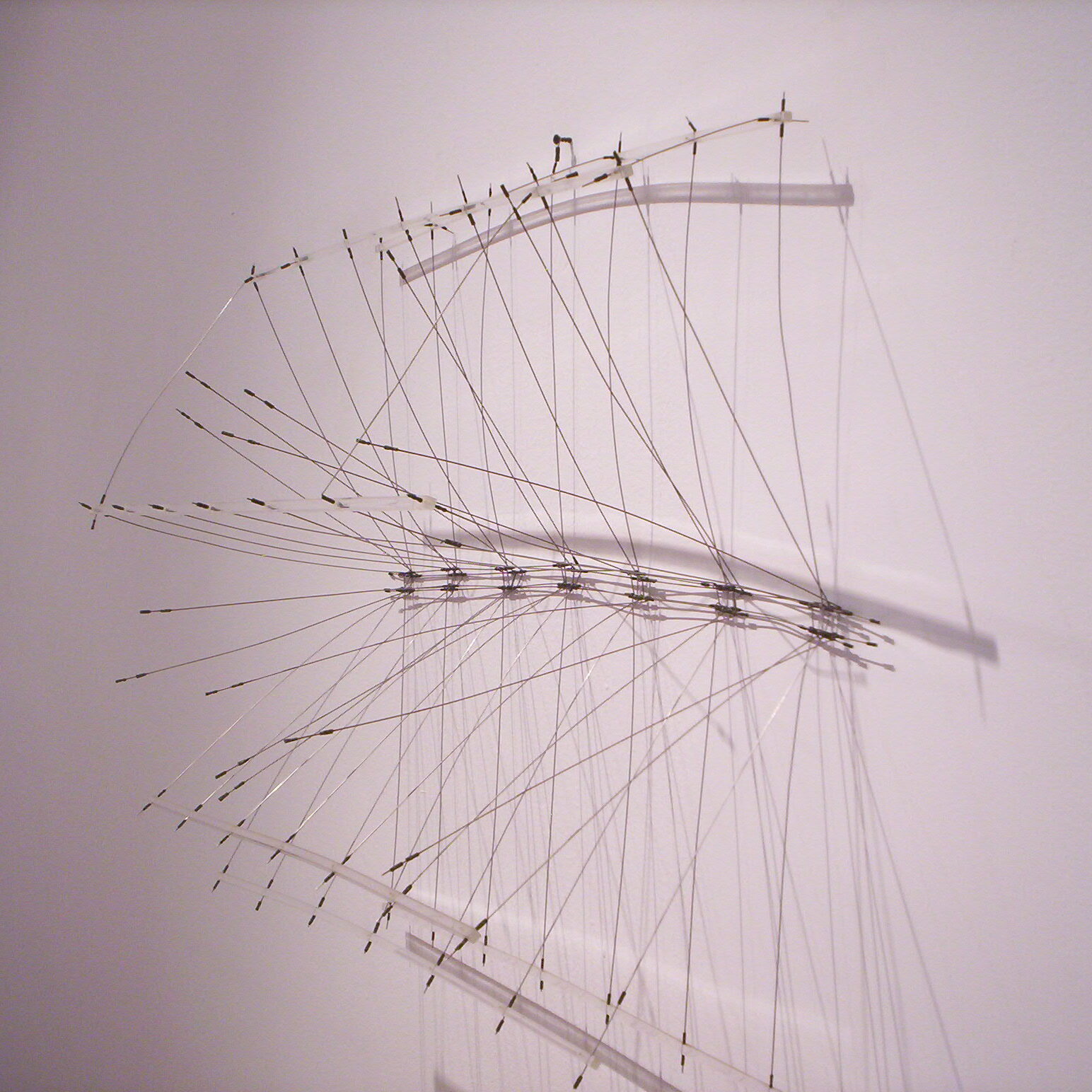 Se podría decir que la obra de Mira Schendel y Lygia Pape, brasileñas, y de Gego, venezolana, comparten una actitud de independencia personal ante la vida y ante las prácticas y tendencias artísticas dominantes de sus respectivas épocas productivas. Gego (1912 -1994) de origen alemán, inicia la fase creativa en sus años de madurez, a fines de los 50, coincidiendo con el momento más contundente del geometrismo y el cinetismo venezolano. Sin embargo, en lugar de continuar en la misma senda, toma un camino tangencial para incursionar en una propuesta que se convierte en organicidad pura, es una obra que revela a través de sus dibujos aéreos y leves estructuras metálicas, las íntimas relaciones entre lo natural y lo geométrico. Su trabajo parte de la geometría, pero aparece como mucho más orgánico, con líneas que se entrecruzan, se alteran de manera aleatoria como en una enramada, en la cual las ramas verdaderas se confunden con sus propias sombras, sin embargo, no es una obra que pretenda representación. Todo en el universo puede reducirse a una estructura que se ancla en relaciones geométricas, pero se mueve, se deforma, se estira, se encoge, flota o vuela dentro de la vitalidad del mundo natural, y que al mismo tiempo, es más frágil, más sutil, más íntima y más ligada a un ordenamiento – paradójicamente – caótico, inestable, cambiante pero al mismo tiempo estimulante y reflexivo. Es una obra que se contrapone al autoritarismo de los movimientos del momento, a una cierta masculinidad de la línea y del espacio – se dice que la línea recta es la distancia más corta entre dos puntos… sin embargo, es usual que las mujeres tomen un camino que no busque acortar la distancia, sino entender su recorrido.