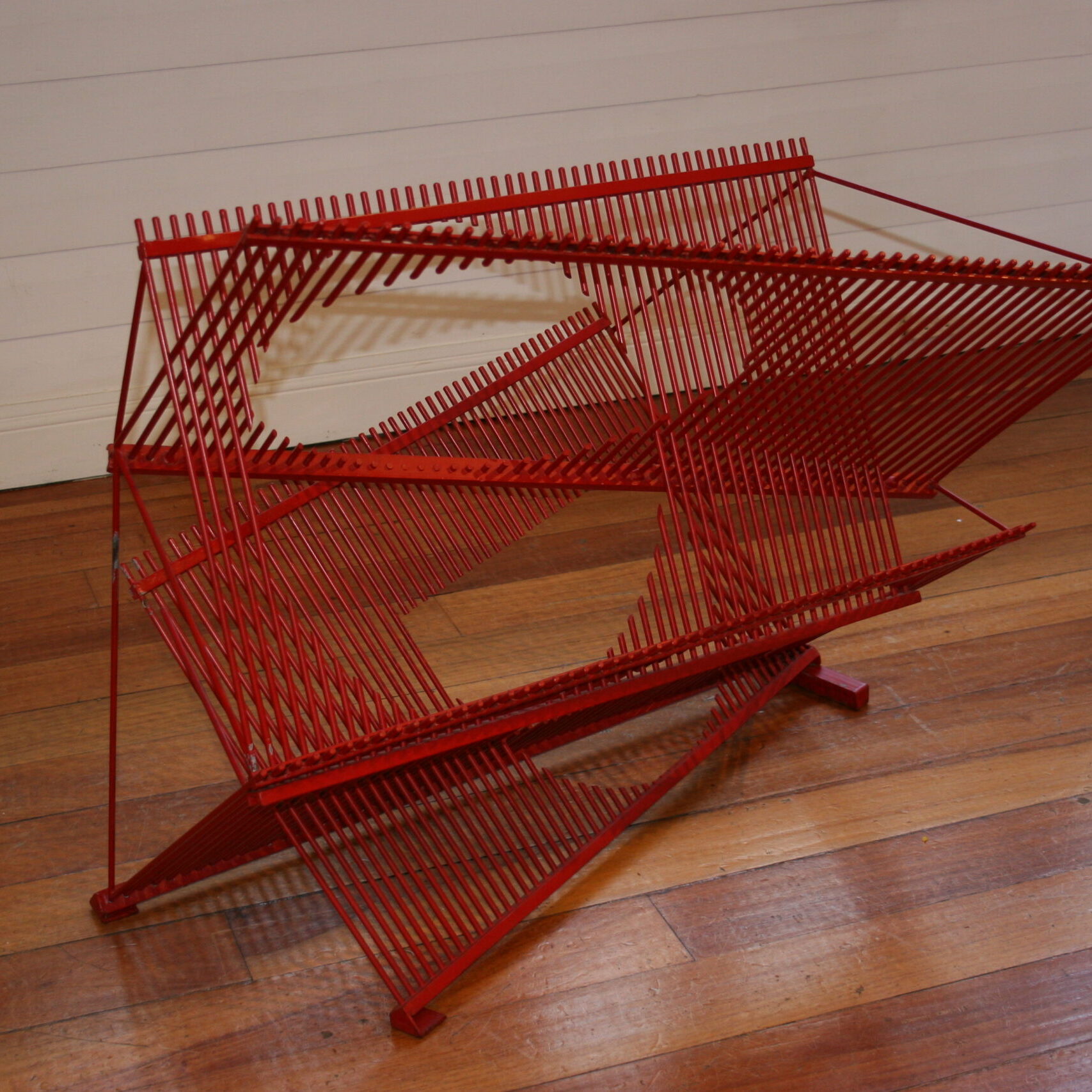 El conjunto de obras de Gego funciona como un pequeño inventario de formas: la línea no tenia secretos para esta extraordinaria artista y en sus obras es evidente una capacidad de trascender los límites del dibujo y re-materializarlo con su mismo proceso de separación de un soporte, volviéndolo línea pura, haciendo que podamos percibir realmente las intersecciones de planos diversos y formación de volúmenes, tan aéreos como reales. El mundo natural subyace una serie de estructuras abstractas que se acercan a las cascadas, los troncos, las mallas. TEOR/éTica muestra un “dibujo sin papel” de 1987 – una idea fantástica de llamarlo dibujo sin papel, pues deja de ser un objeto y se percibe como línea. Un objeto mucho anterior, ensamblaje de hierro pintado, de 1967 recuerda vagamente ciertas obras de los geométricos venezolanos, pero también tiene algo que remite a un objeto cotidiano, pareciera algo plegable, remontable… De sus famosas “reticuláreas” tenemos la suerte de contar con una mediana realizado entre 1971 y 1976: estas mallas de líneas metálicas que se van configurando por su propio peso y extensión, y que conforman estructuras dibujadas en el aire, en diversos tipos de formas, integrando el espacio de maneras diversas. También podremos ver dos tejeduras, una de 1989 y 1990: estas piezas, delicadamente dibujadas a partir de tiras de papel entrecruzadas como el tejido de un canasto, del fondo de una silla, de los hilos de un telar, pero dentro de un esquema de geometría flexible. Finalmente, una pequeña cascada de 1985, llamada “Haare” – cabellos – realizada con materiales de floristería y pasamanería. Todas estas piezas muestran la ilimitada forma de Gego de asumir estas extensiones del dibujo y de construir en el espacio, sin realmente entrar en el terreno de lo escultórico a pesar de la volumetría de las obras… es una especia de cuestionamiento que hace de la línea para averiguar hasta donde sigue siéndolo…