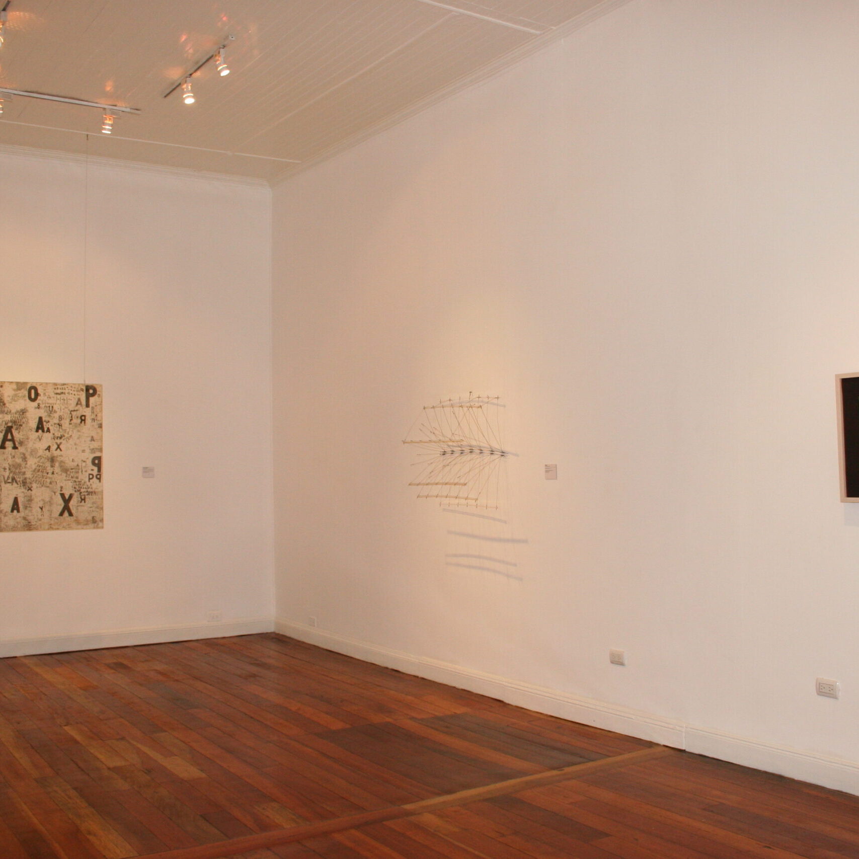 La muestra que presenta TEOR/éTica se compone de trece obras de pequeño formato, entre las cuales dos piezas de Lygia Pape, de 1954, correspondientes al período de búsqueda en el arte concreto. De Mira Schendel contamos con obras de la década del 60, tres pequeñas monotipias, trazos delicados y mínimos sobre un formato vertical, líneas sutiles que sin embargo, al cortar este espacio, físicamente pequeño, confieren a la obra una dimensión casi cosmológica en su mismo vacío. Una pieza cuadrada de la serie de Objetos Gráficos completa este conjunto: grafismos de diversos tipos cohabitan sobre el delicado papel japonés, desde letras sólidas hasta lo que pareciera ser figurillas infantiles o garabatos, flotando en sucesivos planos sobre un esbozo de planta o trama arquitectónica precaria o sugerida, una estructura invisible para sostener este universo gráfico. (no tengo imagen de la constelación ni referencia)