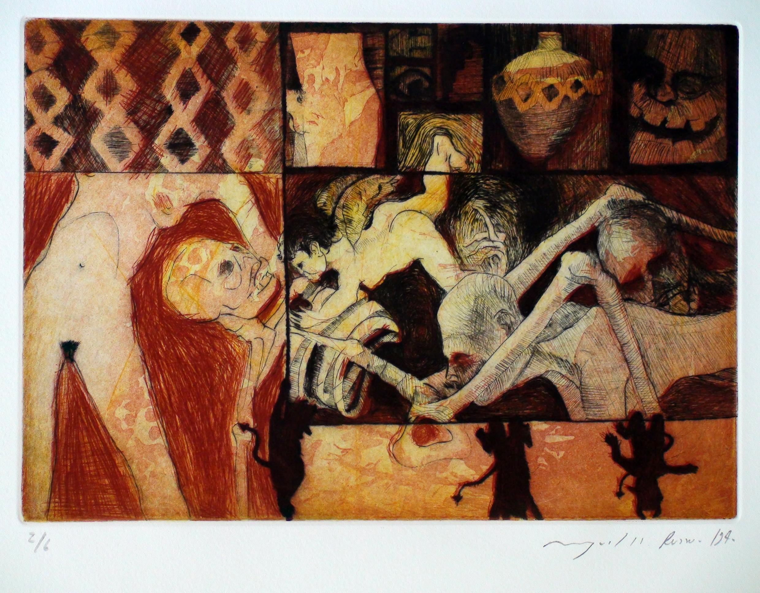 Compartimos un audio del artista costarricense Adrián Arguedas, quien nos habla de la obra Sin título (1994), que forma parte de la Colección Virginia Pérez-Ratton. Esta pieza forma parte de Conjunto sexual, una serie de grabados en metal desarrollados en 1993 y 1994 que exploran las relaciones interpersonales y los encuentros sexuales. El artista, quien entonces residía en París, combinaba elementos visuales que encontraba diariamente en su deriva por la ciudad, reflejando también la muerte y los aún efectos violentos del VIH/SIDA a través de trazos expresionistas de cuerpos transfigurados en cadáveres.