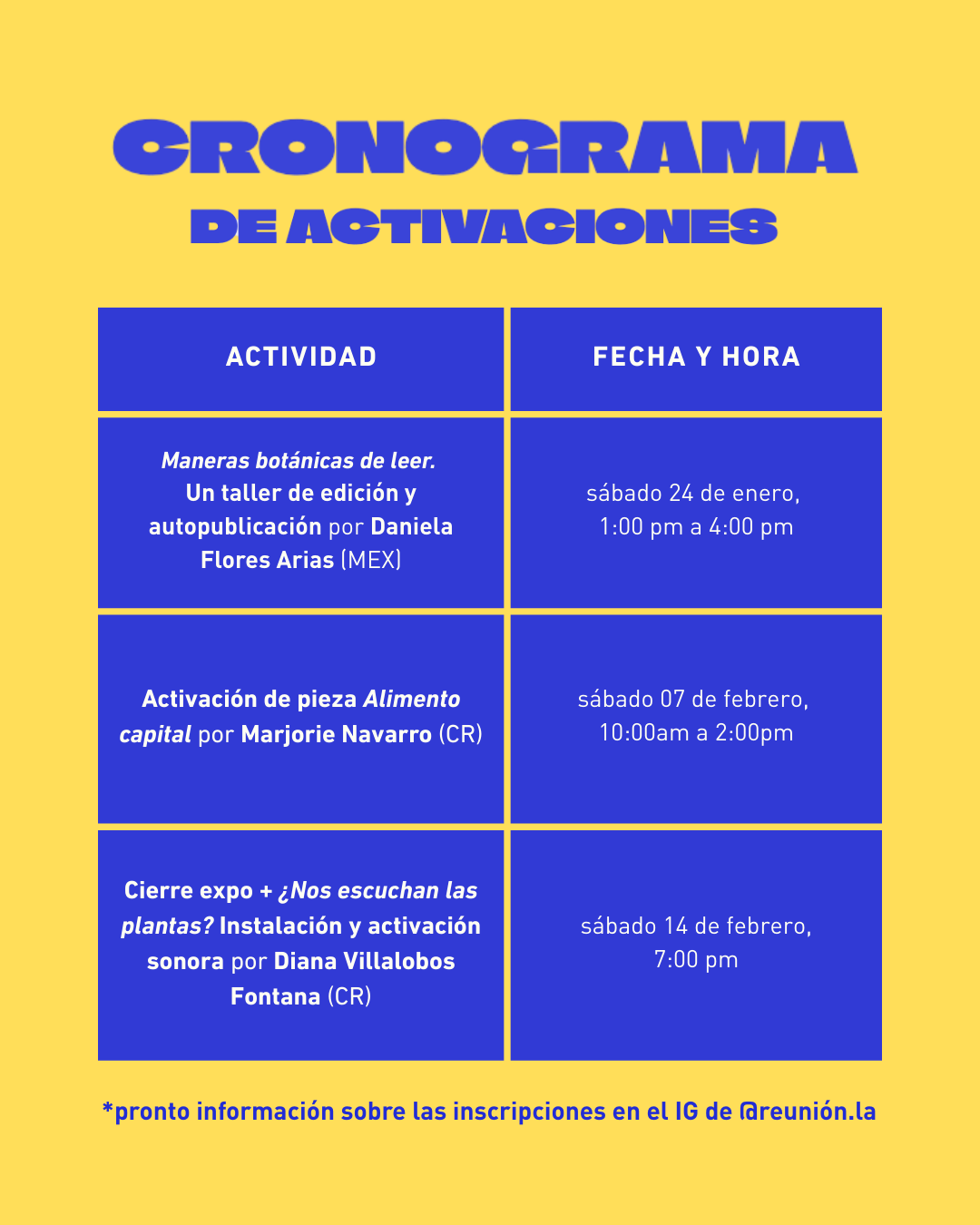 Para comenzar, extendimos las fechas de visita para la exposición Nos Miran las Plantas, curada por Sergio Rojas Chaves y Carlos Fernández de REUNION CR, la cual estará abierta hasta el próximo 14 de febrero. Además, la exposición contará con tres activaciones más antes de su cierre. (Abajo encontrarán una tabla con las fechas y horarios de las actividades.)
