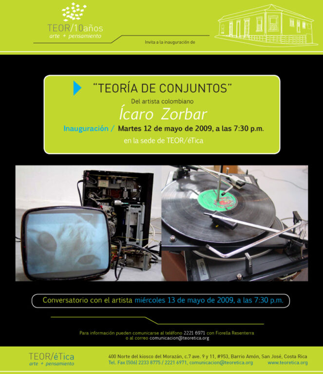 ACERCA DE LA EXPOSICIÓN Teoría de conjuntos 12 de mayo – 12 de junio 2009 Curaduría: Jurgen Ureña Las cosas ofrecen un estado orbital. Esa es probablemente la revelación más significativa y esclarecedora en el trabajo reciente del colombiano Ícaro Zorbar. Los objetos encontrados, diseccionados, desarticulados y reensamblados por el artista, se convierten en nuevas…