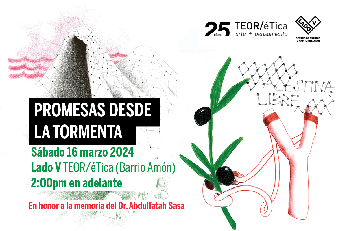 Con Promesas desde la tormenta queremos generar un espacio para aprender, desaprender y compartir de forma más cercana varios de los sentires que nos han atravesado al ser testigos de lo que sucede actualmente en Palestina, situación que en realidad se extiende mucho más atrás en el tiempo. Pensamos en la poesía, la comida, los tejidos y otros elementos como medios para acercarnos a la cultura y experiencia del pueblo palestino que hoy sigue resistiendo ante la ocupación y el exterminio. Con la convicción de que la solidaridad surge desde la práctica cotidiana, nos aferramos al poder de los actos simbólicos, a la fuerza que se enciende cuando nos leemos, nos escuchamos y generamos conversaciones y compartimos conocimiento.